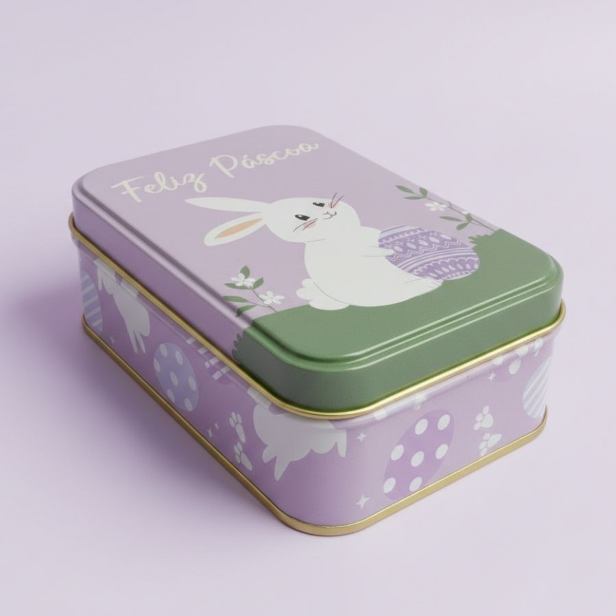 A Lata de Metal Retangular de Páscoa com estampa de Coelho Feliz Páscoa é um item decorativo e funcional, ideal para armazenar doces, lembrancinhas ou pequenos itens de confeitaria. Sua cor lilás suave e o design temático transmitem alegria, charme e sofisticação, tornando-a perfeita para composições de Páscoa com acabamento premium.