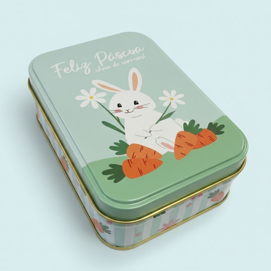 Lata de metal retangular decorativa, verde, com estampa de Coelho Feliz Páscoa, 12,2x8,5x4,5cm, ideal para presentes, doces e decoração temática.