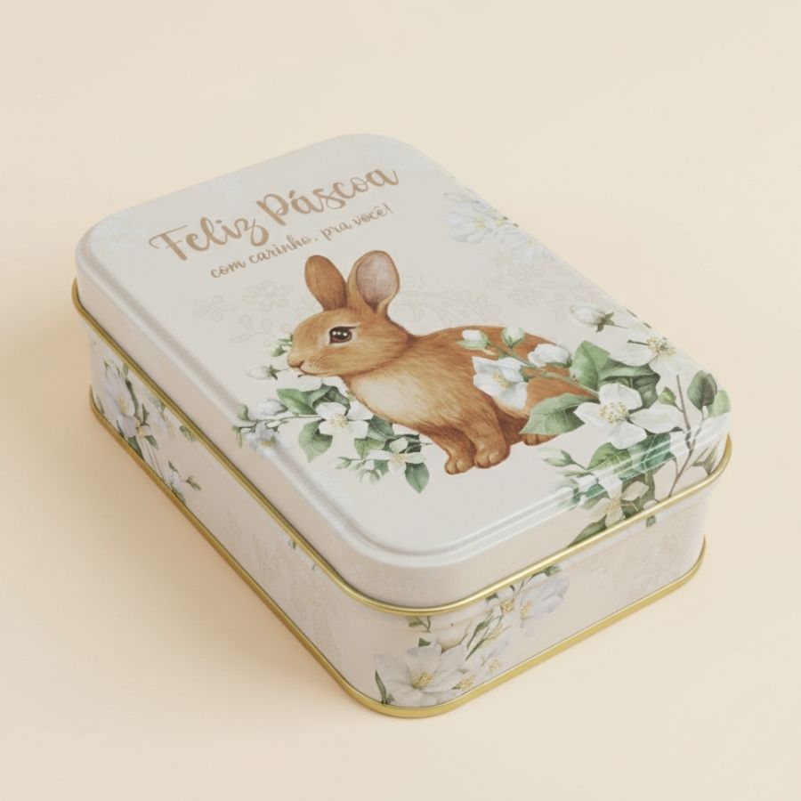 Lata de metal retangular decorativa, branca, com estampa de Coelho Flores, 12,2x8,5x4,5cm, perfeita para presentes, doces e decoração temática.