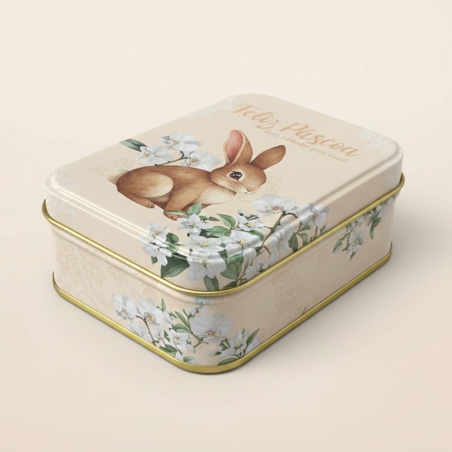 A Lata de Metal Retangular de Páscoa com estampa de Coelho Flores é um item decorativo delicado e funcional, ideal para guardar doces, lembrancinhas ou pequenos itens de confeitaria. A cor creme suave e o design floral transmitem doçura, elegância e charme, agregando um toque artesanal e sofisticado às composições de Páscoa.