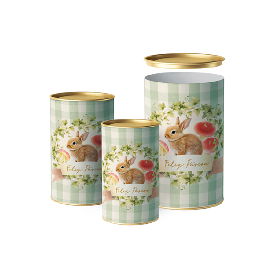 Lata redonda de papel cartão e metal, ideal para guardar ovos da páscoa, com estampa xadrez verde por toda lata destacando uma guirlanda, com um coelho entre cogumelos dentro, e a mensagem sobre a guirlanda "Feliz Páscoa"