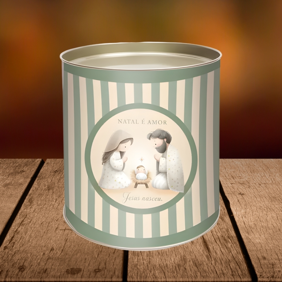 Lata rígida decorada para panetone de 100g, tema “Belém Listras”. Indicada para embalar, presentear e proteger panetones, oferecendo resistência e apelo visual.