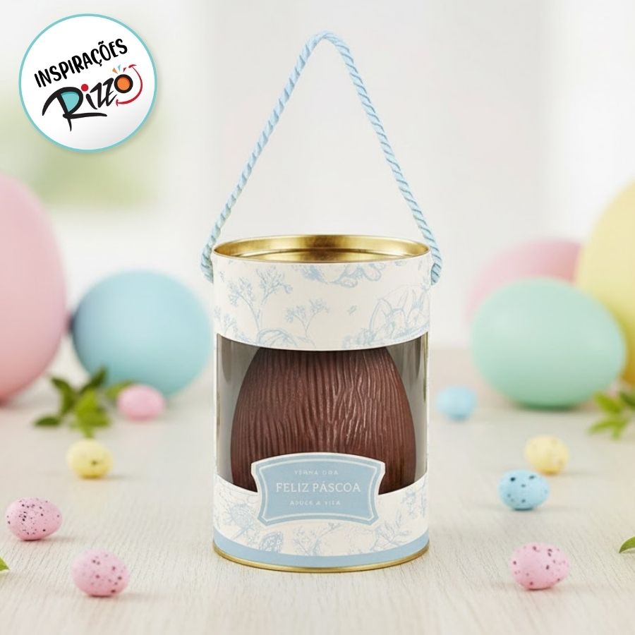 Fabricada em material rígido e durável, a lata pode ser reutilizada após a Páscoa como item decorativo ou organizador. O acabamento em azul, combinado com o visor e a alça, torna a embalagem versátil, perfeita para confeiteiros, lojistas ou para quem deseja presentear com estilo e sofisticação. Seu formato cilíndrico mantém o ovo firme e protegido.