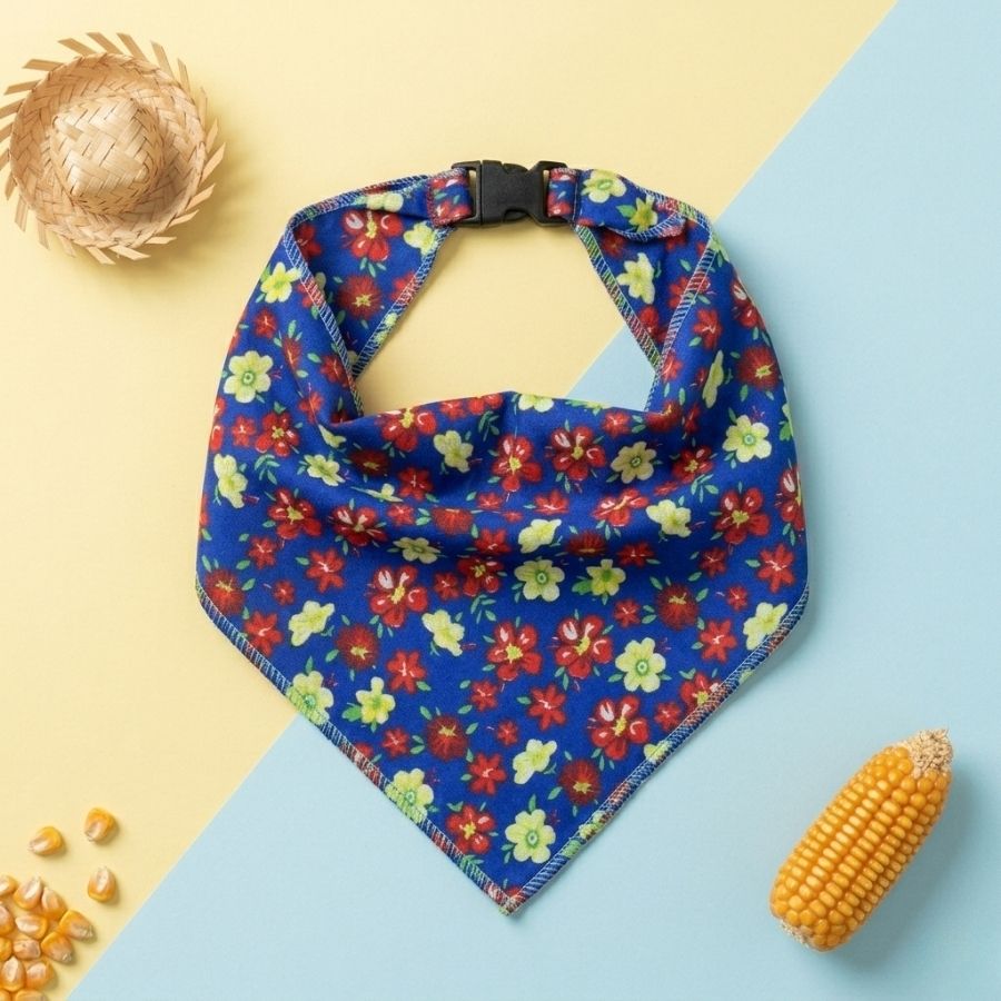 Lenço caipira azul escuro com estampa floral, tamanho M, ideal para compor fantasias e acessórios de festas juninas, trazendo charme e autenticidade.