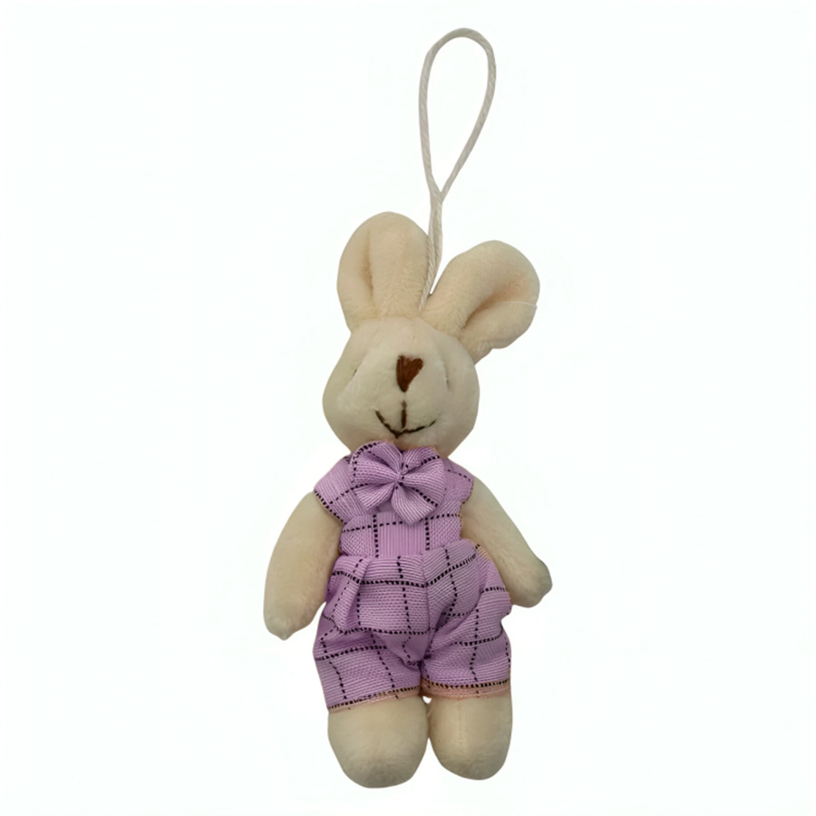 Mini coelho com macacão lilás xadrez e cordão para pendurar