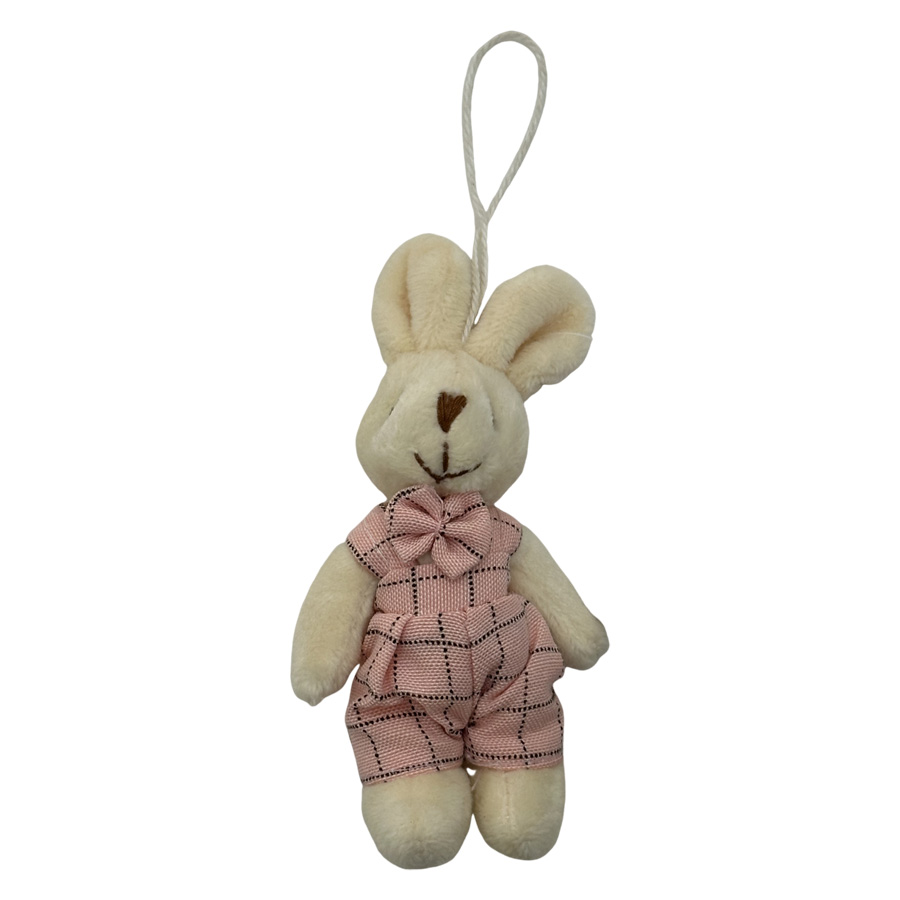 Mini coelho com macacão rosa xadrez e cordão para pendurar