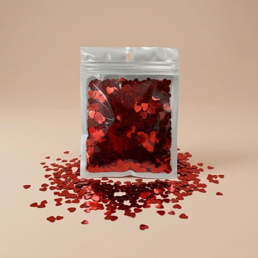 Mini confete metalizado vermelho em formato de coração, ideal para decoração de mesas, presentes, lembrancinhas e eventos românticos.