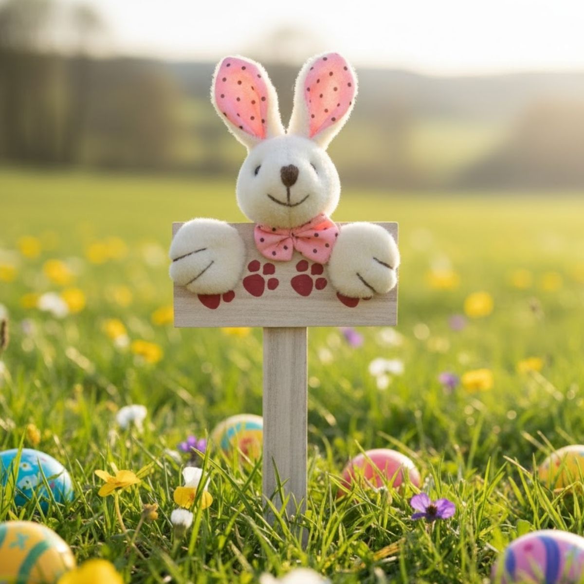 A Mini Placa Patinhas Coelho de Páscoa com Coelhinho e Laço Rosa de Bolinhas é uma decoração irresistível para quem quer trazer um toque fofo e delicado ao ambiente. Feita em madeira, a placa exibe várias patinhas de coelho ilustradas, criando um visual temático encantador. Apoiado sobre ela, está um coelhinho branco com um charmoso laço rosa de bolinhas, que adiciona leveza e um toque meigo à peça.