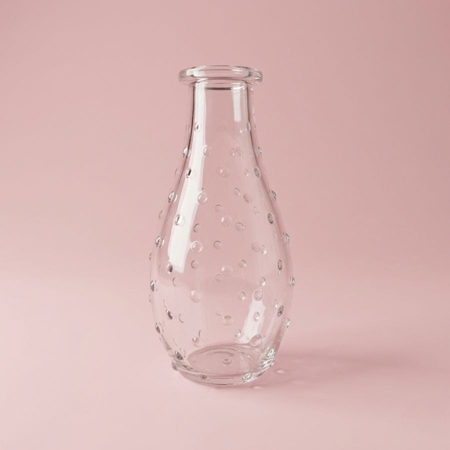 Mini vaso de vidro com textura de bolinhas e tamanho de 14x5,5 cm, ideal para arranjos florais e decoração de mesas e ambientes.