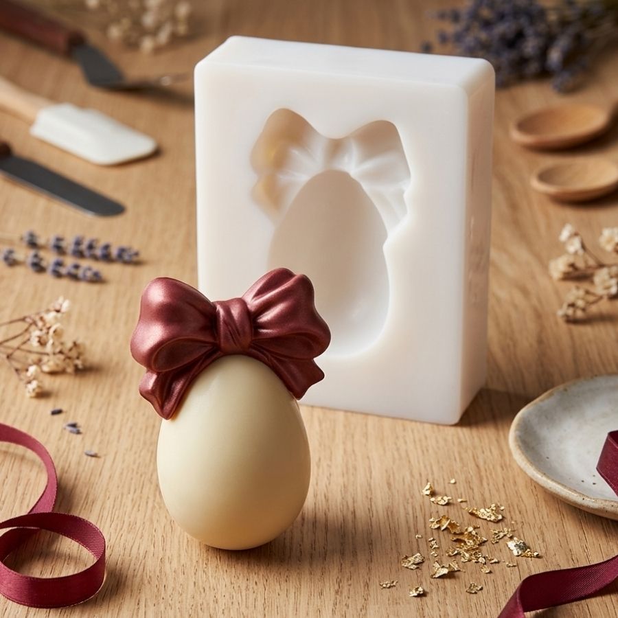 Molde de silicone em formato de ovo de Páscoa com laço, capacidade de 35g, ideal para criar chocolates, sabonetes e peças artesanais com acabamento delicado e detalhado.