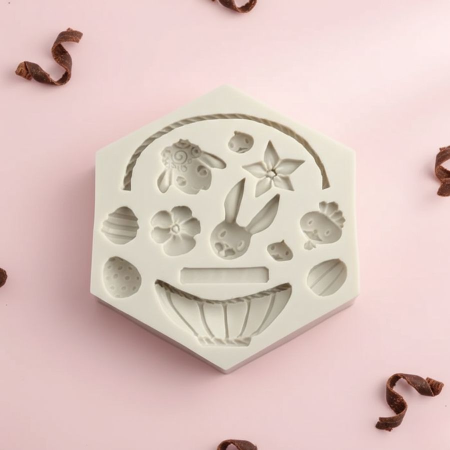 O Molde de Silicone Coelho Ovos e Cesta de Páscoa da Molds Planet é ideal para criar decorações detalhadas e delicadas em produções de Páscoa. Desenvolvido para facilitar a criação de rendas e padrões decorativos, permite resultados precisos e elegantes em bolos, cupcakes, doces e projetos artesanais.