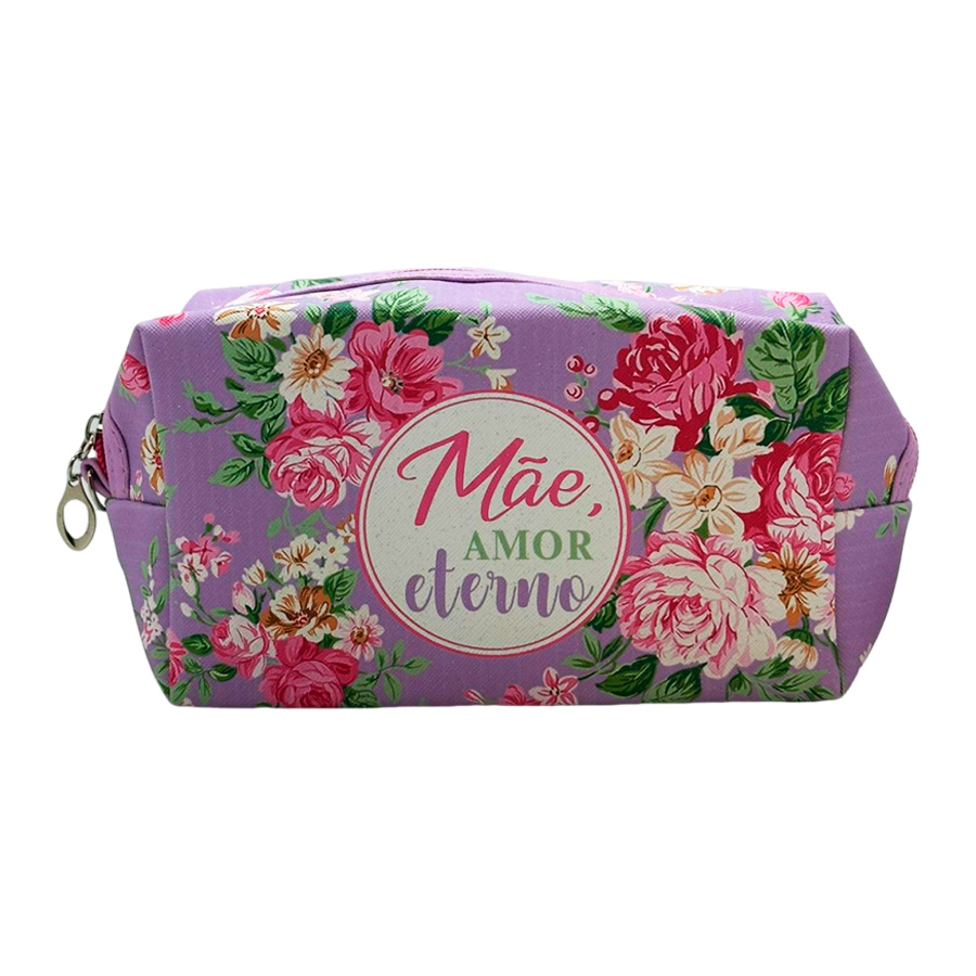 O lilás suave transmite uma sensação de tranquilidade e ternura, enquanto as rosas simbolizam amor e carinho. A mensagem central "Mãe Amor Eterno" adiciona um toque emocional e expressa o amor incondicional entre mãe e filho. Esta necessaire seria perfeita para guardar itens essenciais do dia a dia com estilo e lembrar à mãe o quanto ela é amada e apreciada.