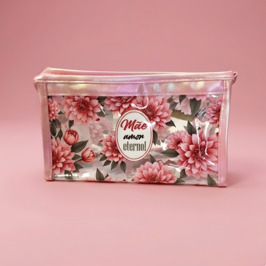 Necessáire fabricada em material transparente com detalhes na cor rosa, medindo aproximadamente 20cm x 12cm x 8cm. Possui estampa com a frase “Mãe Amor Eterno”. Indicada para organização de objetos pessoais. Evitar contato com objetos pontiagudos que possam perfurar ou danificar o material. Para limpeza, utilizar pano macio levemente umedecido e evitar produtos abrasivos para preservar a estampa e a integridade do produto.