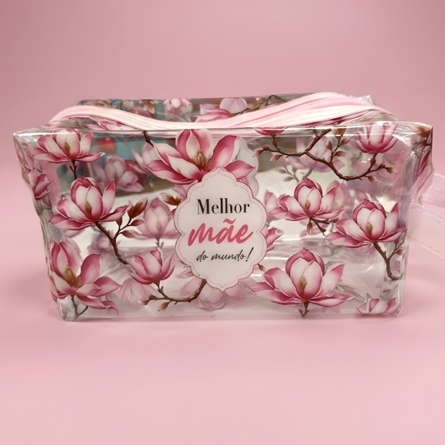 Necessáire fabricada em material transparente com detalhes na cor rosa, medindo aproximadamente 18cm x 9cm x 8cm. Possui estampa com a frase “Melhor Mãe do Mundo”. Indicada para organização de objetos pessoais. Recomenda-se evitar contato com objetos pontiagudos que possam perfurar ou danificar o material. Para limpeza, utilizar pano macio levemente umedecido e evitar produtos abrasivos para preservar a estampa e a integridade do produto.