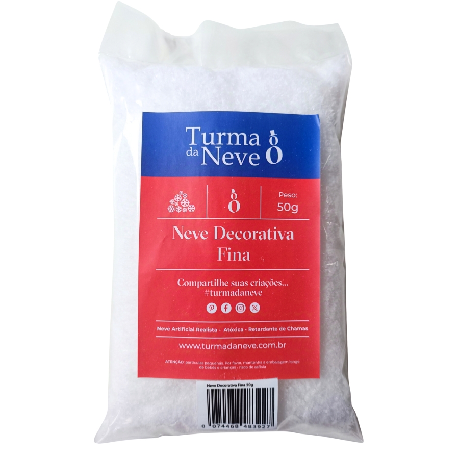 Neve artificial decorativa fina, 50g, ideal para dar o toque final nas suas decorações natalinas.