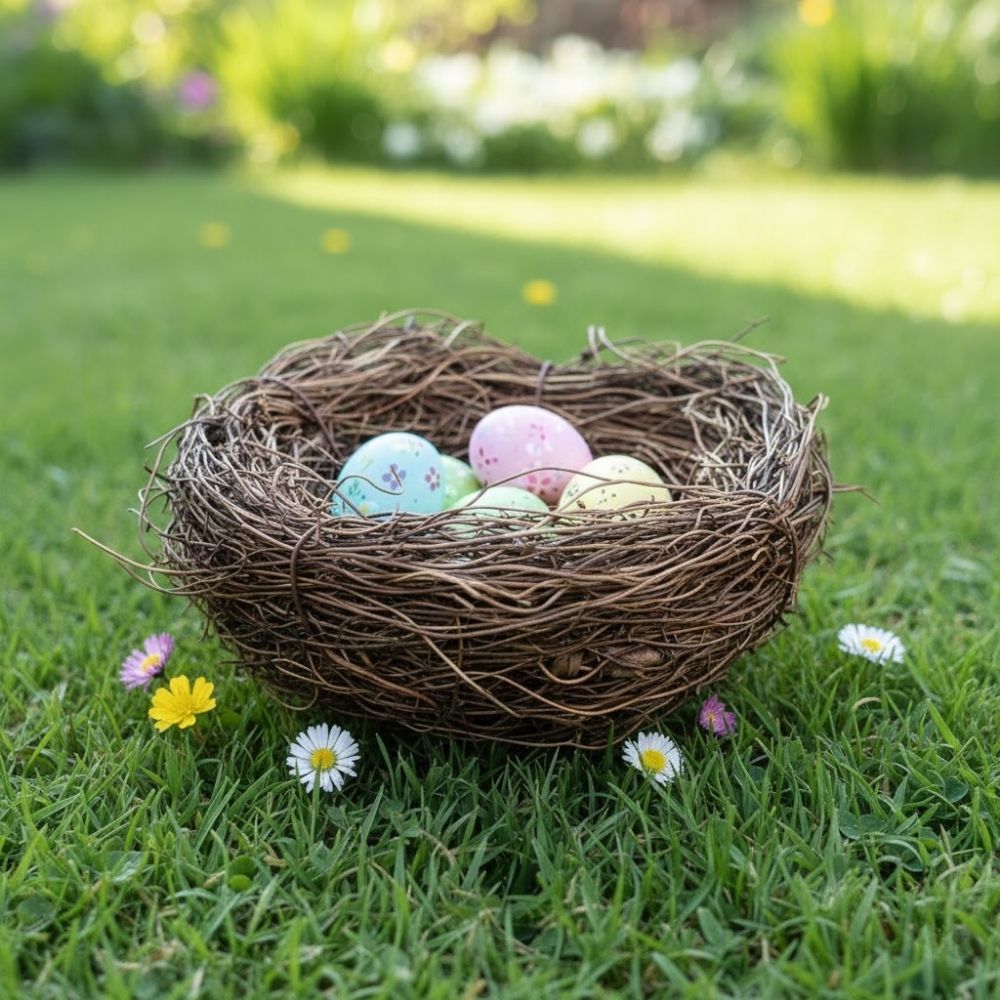 Utilize o ninho como suporte para ovinhos decorativos, ovos de chocolate embalados ou pequenos enfeites. Combine com musgo, flores artificiais, coelhos decorativos ou elementos naturais para criar uma composição harmoniosa. Ideal para mesas de Páscoa, vitrines ou decoração de ambientes internos.