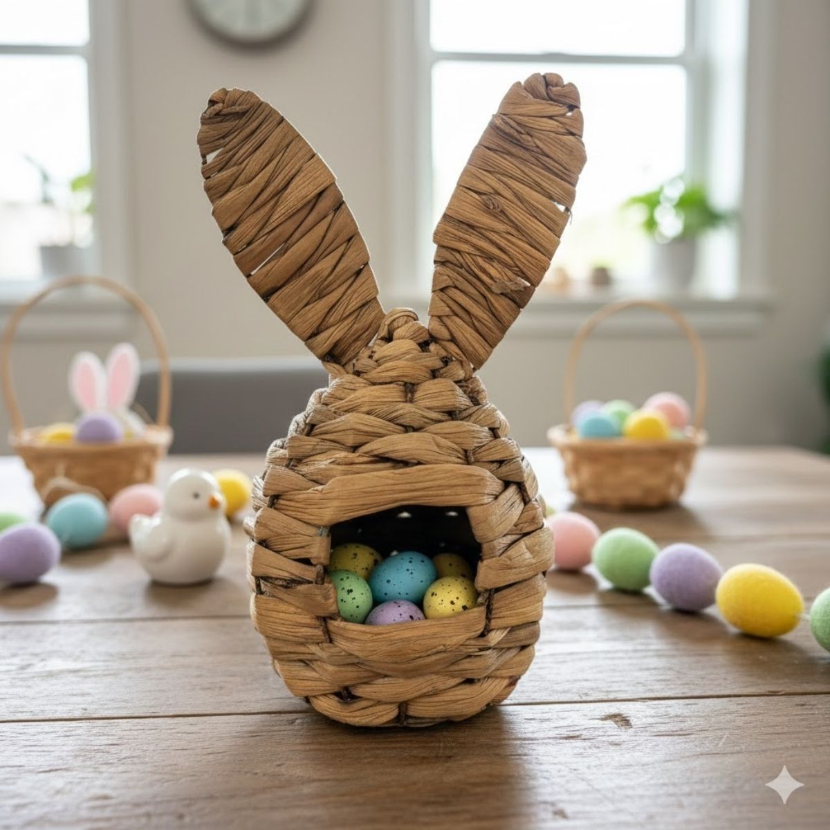 O Enfeite Decorativo de Páscoa no modelo cestinha para ovos é perfeito para compor uma decoração delicada e temática. Com visual meio fechado e uma abertura frontal para acomodar ovos de Páscoa, ela traz um charme especial com as orelhinhas de coelho no topo, remetendo ao clima lúdico e acolhedor da data.