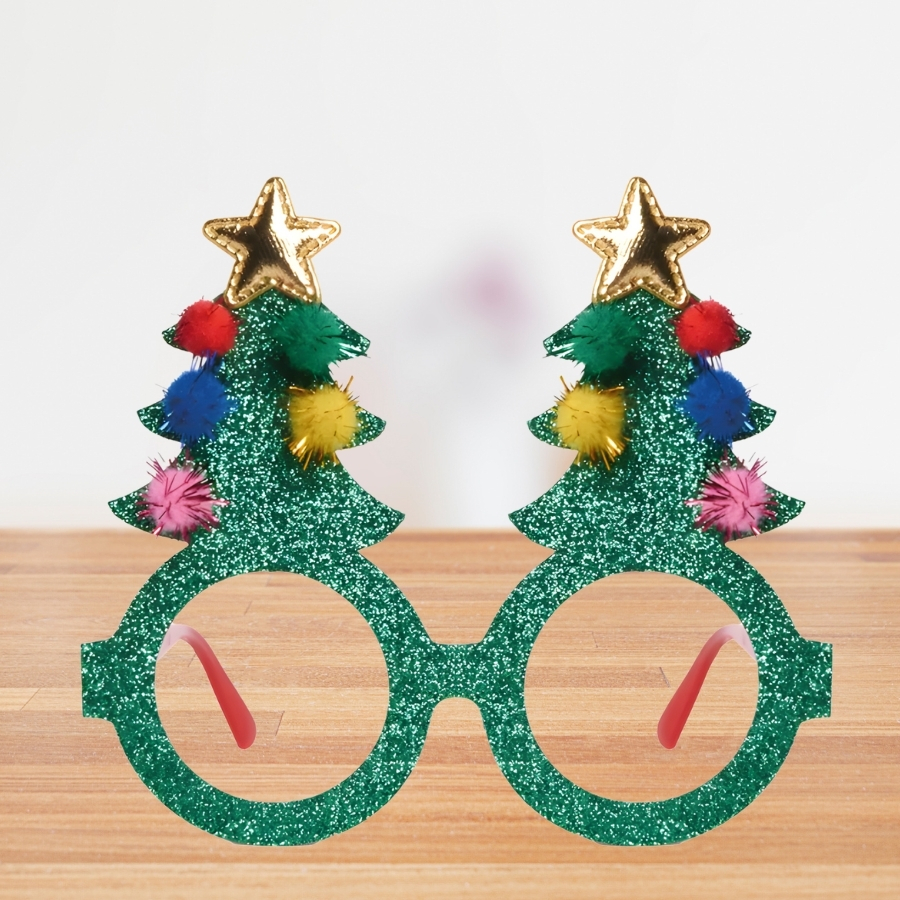 Óculos decorativo de Natal com tema de árvore decorada, medindo 12x14x14,5cm. Ideal para complementar fantasias e animar festas e encontros natalinos.