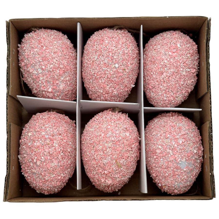 Caixa com 6 enfeite ovo da páscoa de plastico rigido para pendurar, com um tipo de granulado rosa e branco decorativo