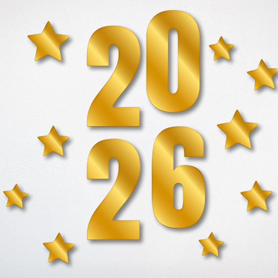Kit decorativo de Ano Novo 2026, acabamento dourado, medidas 16x30cm. Produto decorativo ideal para mesas, painéis e ambientes de festa, proporcionando elegância e charme à celebração de Réveillon.