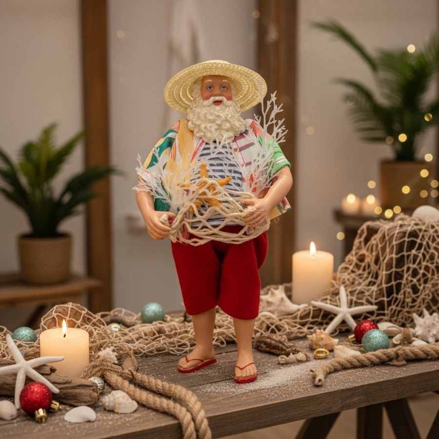 Ideal para quem busca uma decoração de Natal diferente e temática, o Papai Noel Praia combina perfeitamente com ambientes litorâneos ou decorações mais alegres e tropicais. Seu visual artesanal, cheio de detalhes, torna a peça um destaque na mesa, aparador ou vitrine, trazendo leveza e humor para o fim de ano.