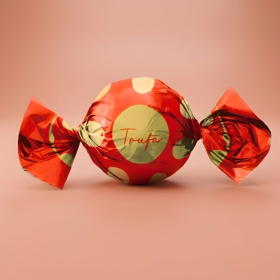 Papel para embalagem de trufas com dimensões aproximadas de 14,5x15,5cm. Estampa Big Ball nas cores vermelho e ouro. Indicado para uso na embalagem de trufas e pequenos doces. Produto destinado ao contato externo com o doce durante o processo de embalagem. Recomenda-se armazenar em local seco, limpo e protegido da umidade para preservar as características do papel.