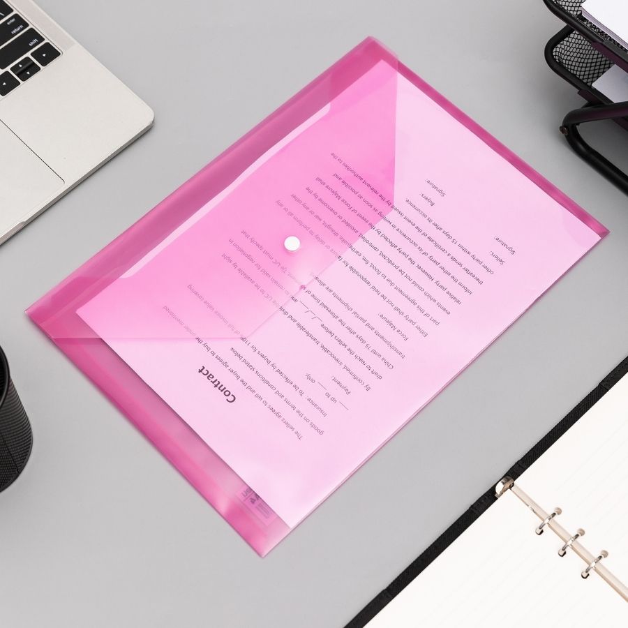 A Pasta Documentos com Fecho de Botão A4 é resistente e prática, ideal para organizar e proteger papéis no formato A4, com fechamento seguro e acabamento na cor rosa.