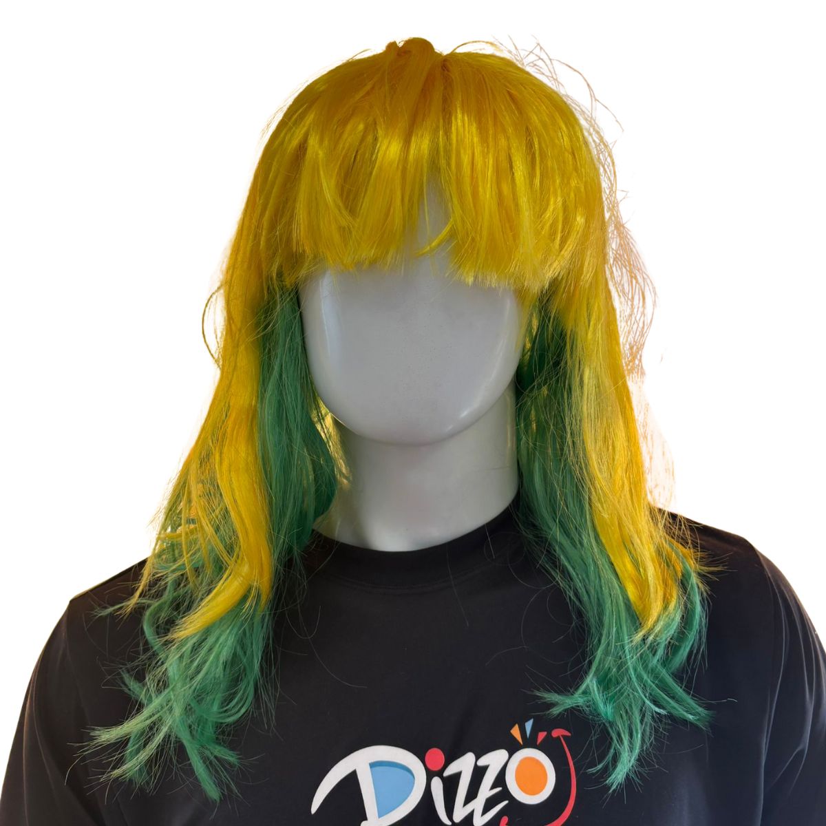 A Peruca Brasil ondulada longa com franja é o acessório ideal para quem quer torcer com muito estilo e personalidade. Com visual marcante nas cores verde e amarelo, ela traz um efeito divertido em camadas, onde a parte superior é amarela e a inferior é verde, criando um contraste vibrante que representa perfeitamente o clima de torcida brasileira.