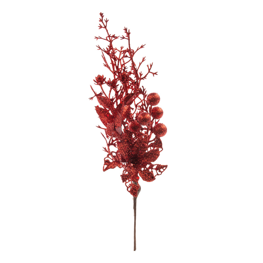 Galho decorativo, com frutinhas, flores e galhos, totalmente cobertos por glitter vermelho