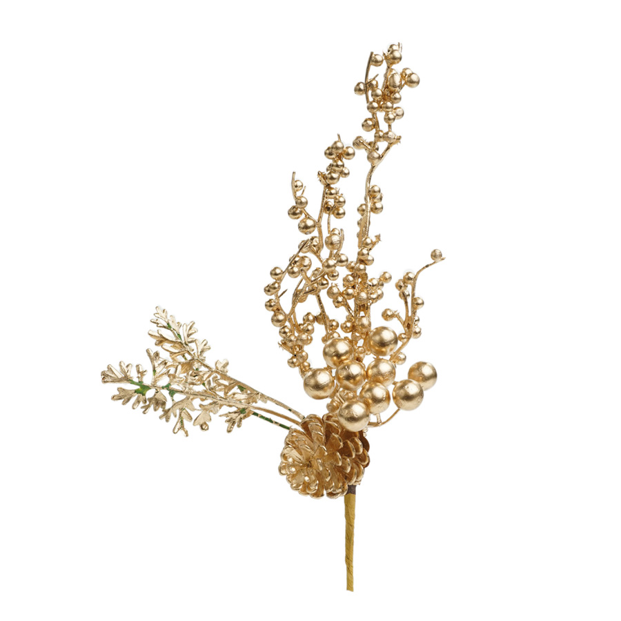 Pick decorativo, de galho com folhas, pinhas e frutinhas, galho inteiro na cor dourada