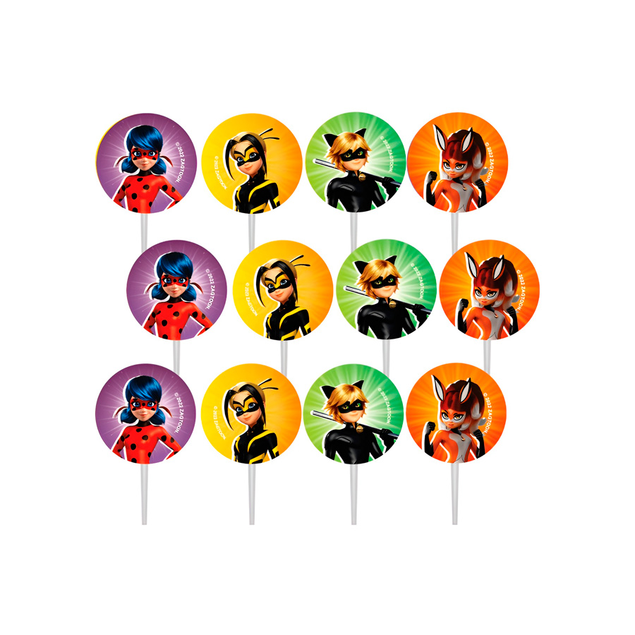 Eleve a sua festa com os palitos decorativos da Ladybug! Estes adoráveis palitos são perfeitos para dar um toque mágico aos seus cupcakes e petiscos. Deixe que a Ladybug e sua turma animada façam parte da celebração, encantando os convidados com estilo e diversão.
