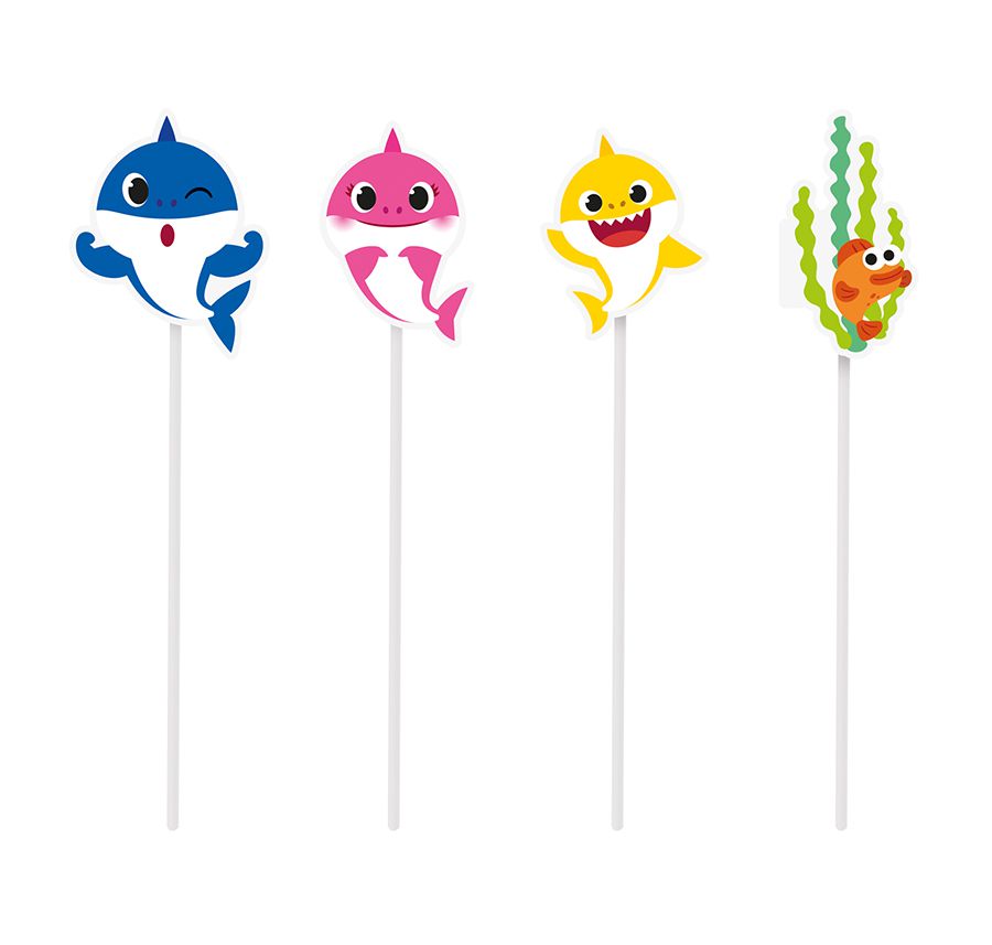 Utilize a O Pick Longo Baby Shark para decorar a mesa principal, ou dentro de cachepots nas mesas.