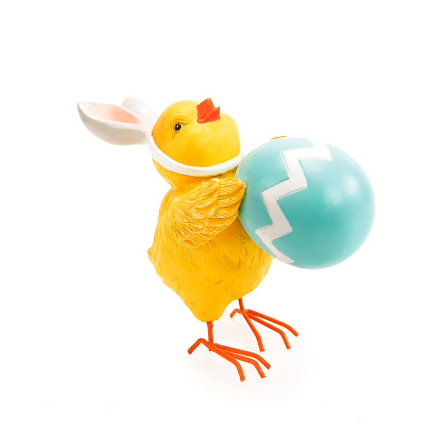O Pintinho Decorativo em Pé Segurando Ovo da Páscoa é uma peça encantadora e única. Este pássaro decorativo, feito em resina, apresenta orelhas de coelho, adicionando um toque lúdico e original à peça. O pintinho segura com cuidado um ovo da Páscoa, criando uma cena adorável e festiva.
