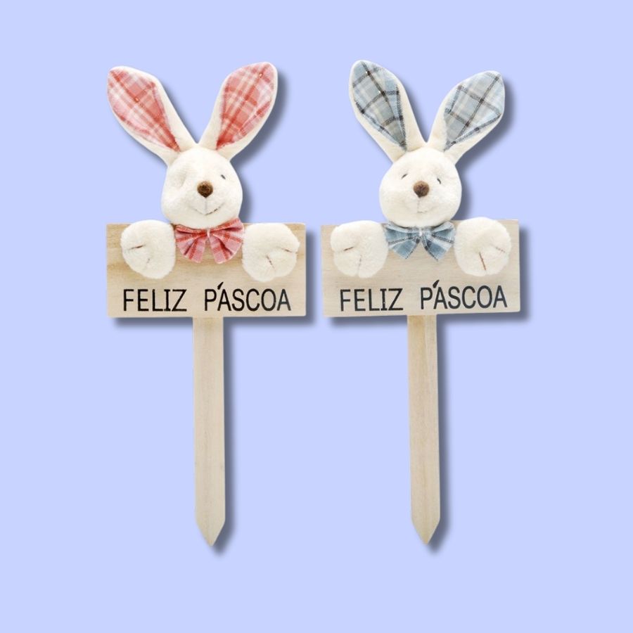 Plaquinha em Madeira Coelho Xadrez - 23x9,5cm - Cromus Páscoa - Rizzo Embalagens