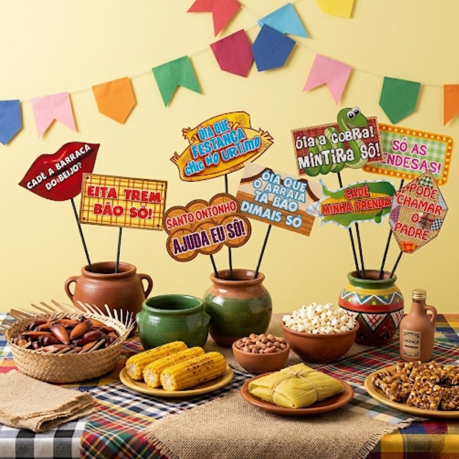 Ideais para usar em arraiás, festas escolares, quermesses, eventos temáticos e comemorações em casa, as placas podem ser utilizadas como acessórios para fotos, decoração de mesas, painéis ou até em espaços instagramáveis. Combine com bandeirinhas, balões, chapéu de palha, milho, pipoca, paçoca e outras delícias típicas para criar um ambiente completo de festa caipira. Dica prática: distribua as placas entre os convidados ou deixe em um cantinho de fotos para incentivar registros divertidos e espontâneos. Se você quer uma decoração prática, acessível e cheia de charme, as placas para festa junina são a escolha certa para garantir interação, diversão e fotos incríveis em qualquer evento.