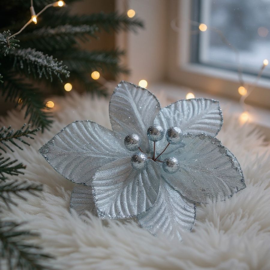 A Poinsétia Decorativa Magnólia Azul Claro com Glitter é moderna, delicada e elegante, perfeita para compor decorações natalinas com leveza e brilho.