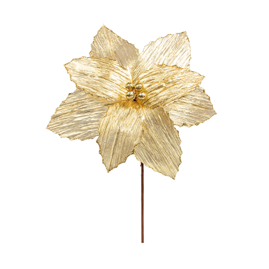 Poinsétia decorativa com pétalas douradas, com as bordas das petalas e carpelo meio da flor coberto por glitter dourado