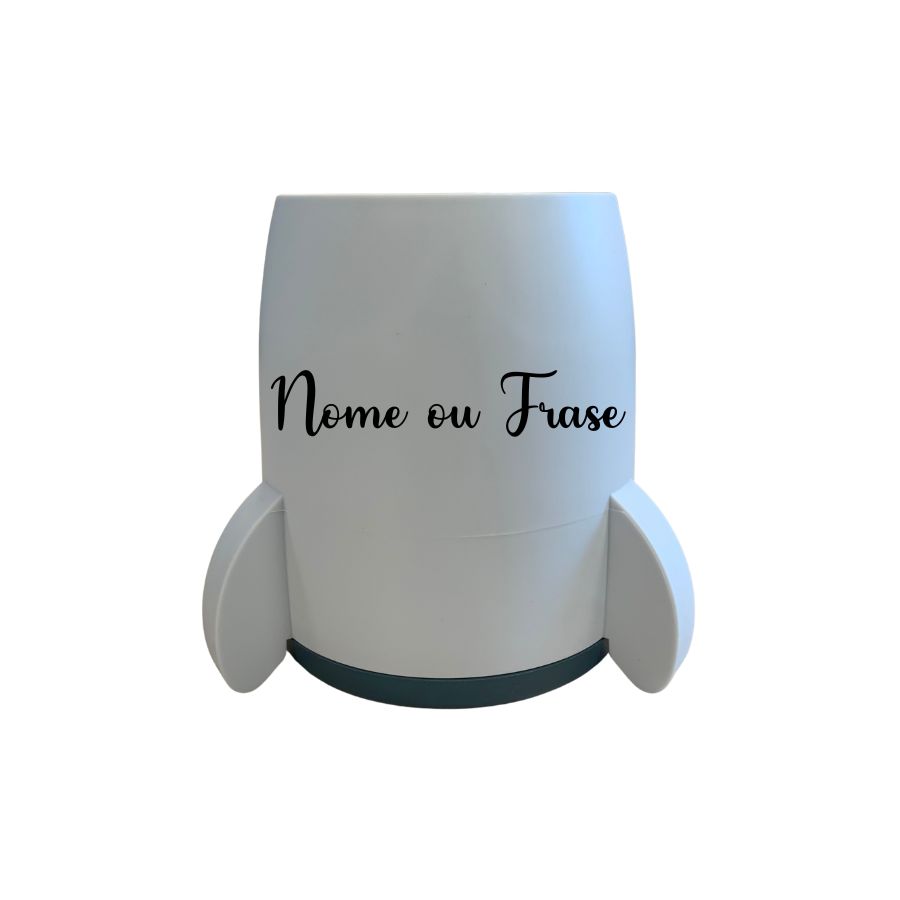 Porta-lápis em formato de foguete com escrita preta personalizada. Criativo, compacto e cheio de estilo.