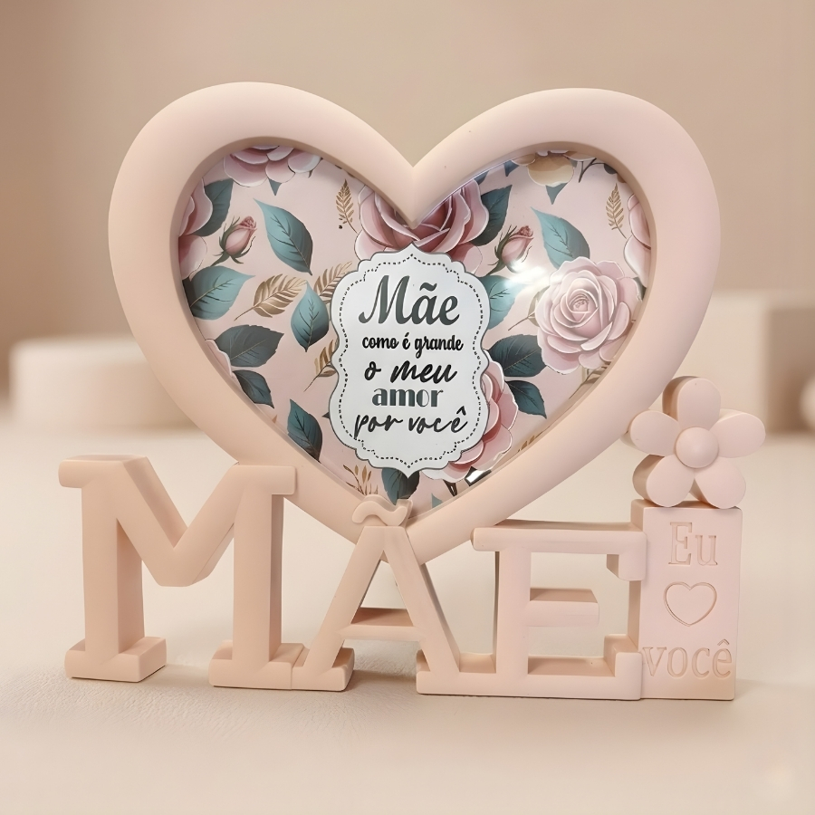 Porta-retrato decorativo com moldura em formato de coração, na cor rosa claro, com frase temática “Mãe Como é Grande o Meu Amor Por Você”. Compatível com fotografia no tamanho 10x15 cm. Indicado para uso em ambientes internos, apoiado em superfícies planas. Recomenda-se evitar exposição prolongada à umidade, luz solar direta e quedas para melhor conservação. A limpeza deve ser realizada com pano seco ou levemente umedecido, sem produtos abrasivos.