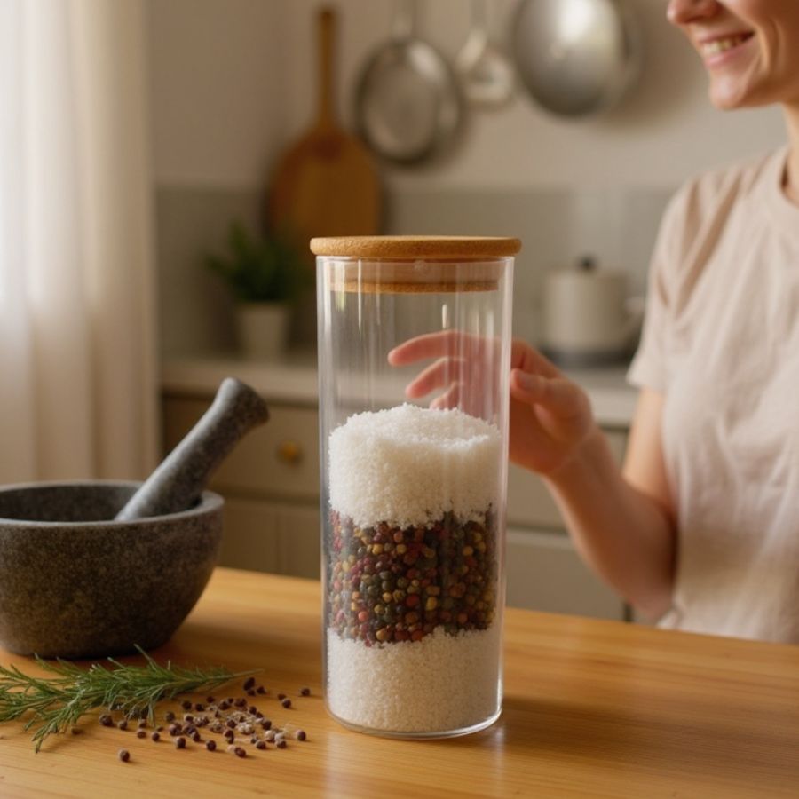 Com capacidade de 375ml, é ideal para armazenar grãos, temperos, biscoitos, castanhas, chás e pequenos mantimentos, além de compor uma decoração charmosa e natural em prateleiras e despensas.
