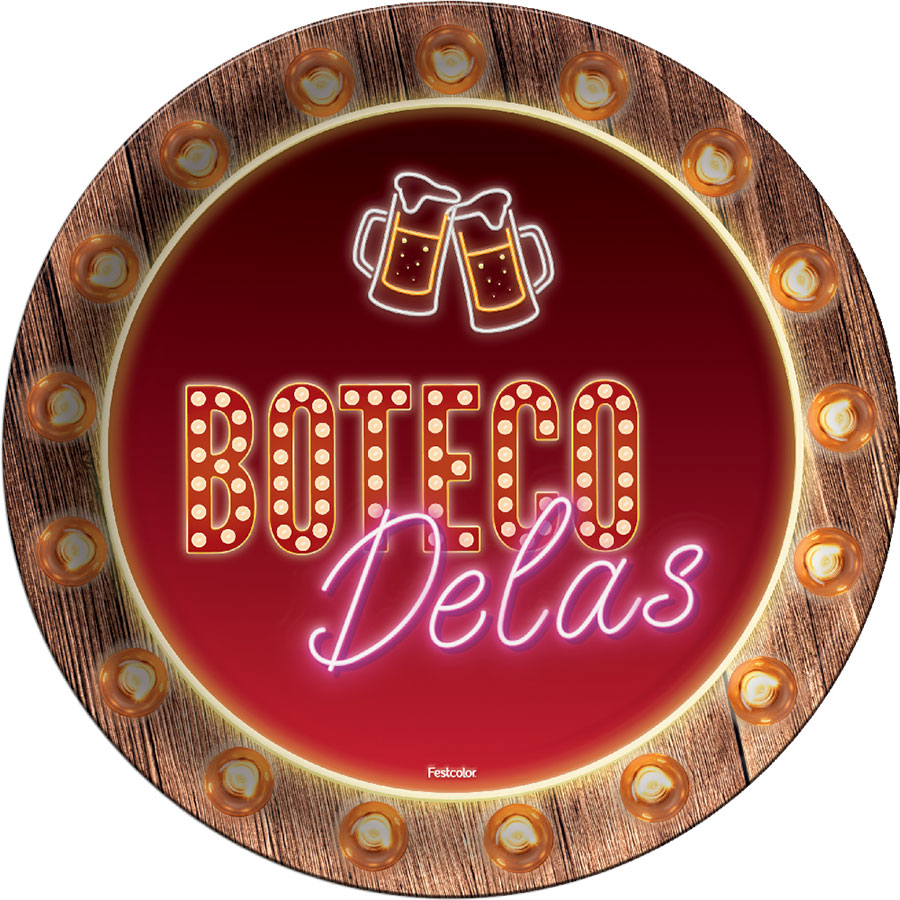 Um pacote contendo 08 unidades de prato de papel redondo com o tema Boteco Delas