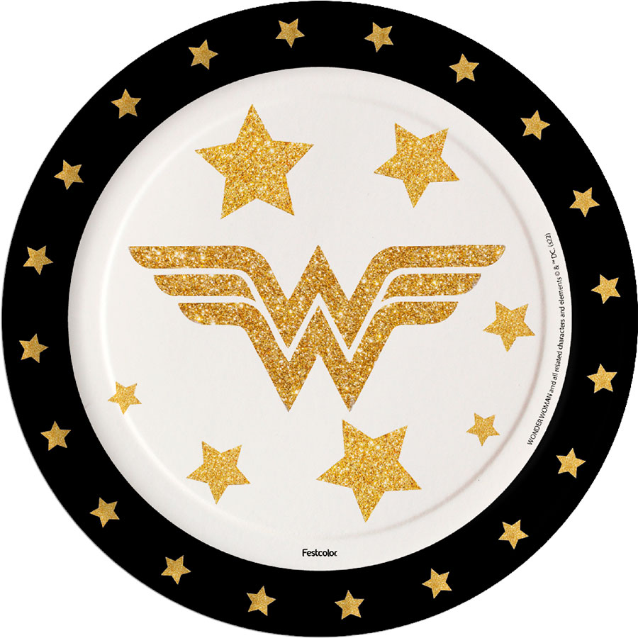 Um pacote contendo 08 unidades de prato de papel redondo com o tema Mulher Maravilha Luxo