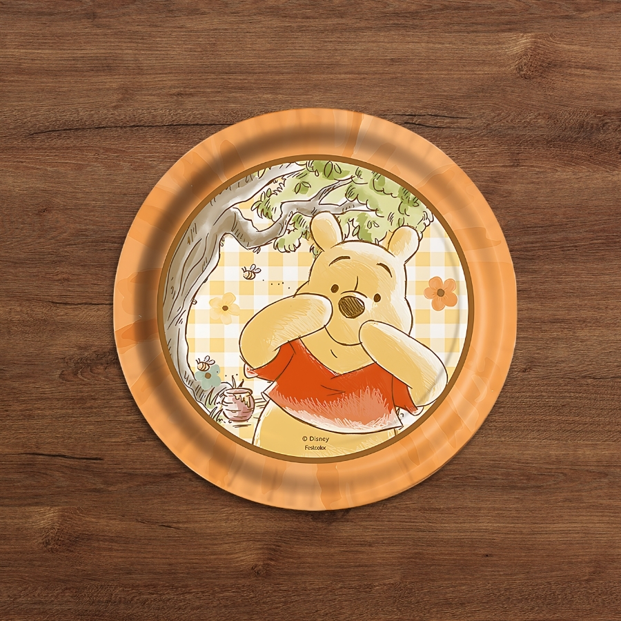 O Prato de Papel Redondo Ursinho Pooh possui 18x18cm, é produzido em material resistente e colorido, pronto para uso em festas infantis ou eventos com tema Pooh. Combina praticidade e charme em um único item.
