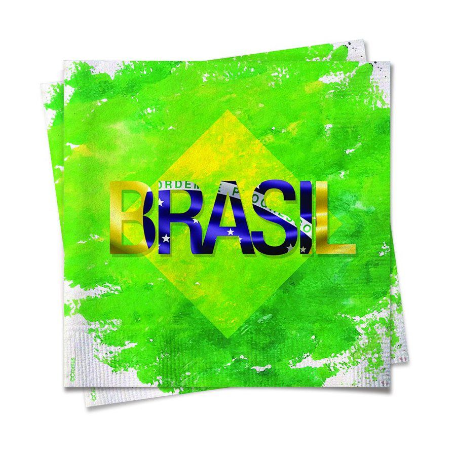 Guardanapo em papel estampado com "Brasil" e uma bandeira estilizada em aquarela.