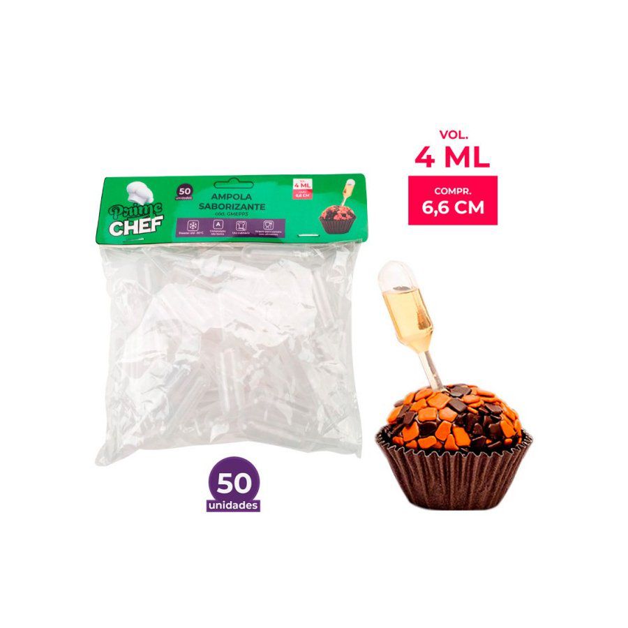 A ampola saborizante é um mini conta gotas de plástico que adicionam uma experiência sinestésica ao seu cliente e quem vai comer seus docinhos ou cupcakes. Além de encantar com os olhos (e sabor) adicione uma experiência táctil com o ato de apertar a ampola para que o cliente adicione o sabor quando quiser.