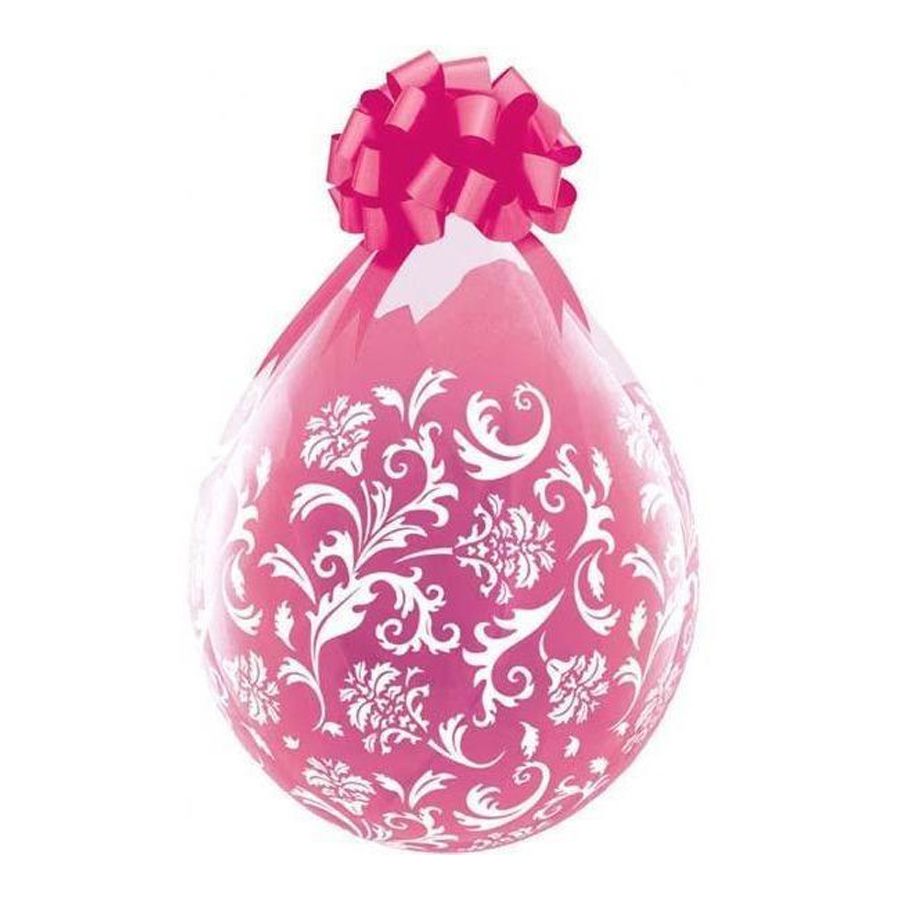 1 pacote com 25 unidades do balão no modelo Damasco Transparente e Branco.*Decoração não inclusa.