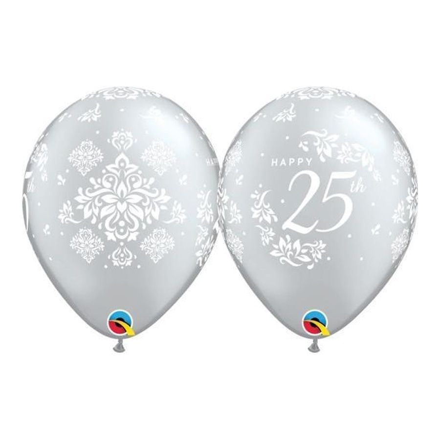 Látex 11 polegadas, aproximadamente 27 cm Contém 50 unidades. 1 pacote com 50 unidades no modelo "feliz 25°" damasco na cor prata Aqui tudo é de extrema qualidade. Transformamos simples momentos, em grandes realizações.