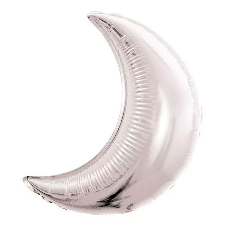Possui 1 balão metalizado no formato meia lua prata e mede: 70'' 32 cm