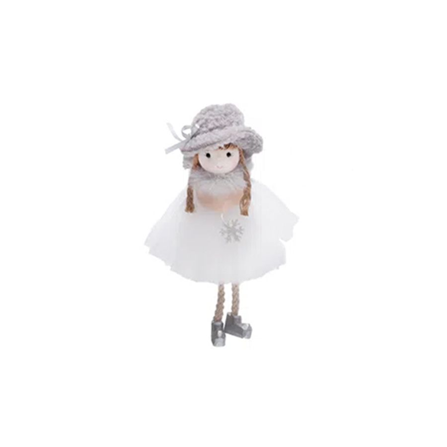 A boneca de chapéu cinza, possuí um vestido de tule branco, um cachecol peludinho branco,cabelos dourados e um sapatinho prata.