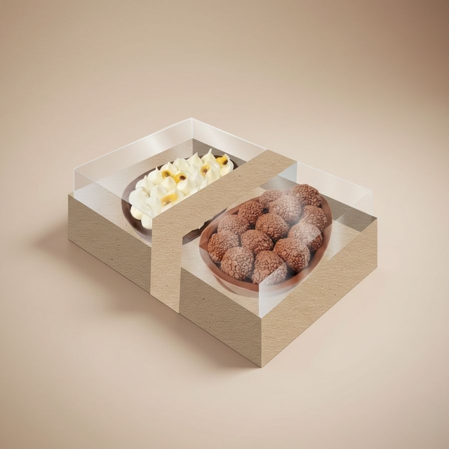 Caixa para dois ovos de colher, M 250g, Kraft com tampa transparente, perfeita para presentes, proteção e apresentação elegante de doces.